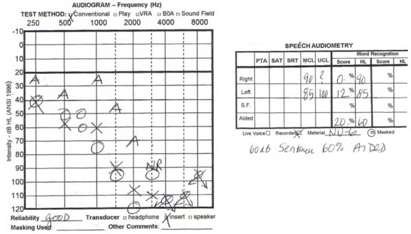 Another patient that I saw in his early 30s was a police officer in a small city in Iowa who woke up one morning and could not hear from his left ear. He had no measurable hearing at the first appointment. Over the course of a few weeks, the hearing thresholds came back to severe to profound in the left ear, but no measurable word recognition. He did end up being a hearing aid user, which I will talk more about later.