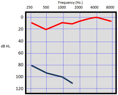 Figure 8. Audiogram from a 52-year-old female with congenital hearing loss who perceived her right ear to be much worse than the left.