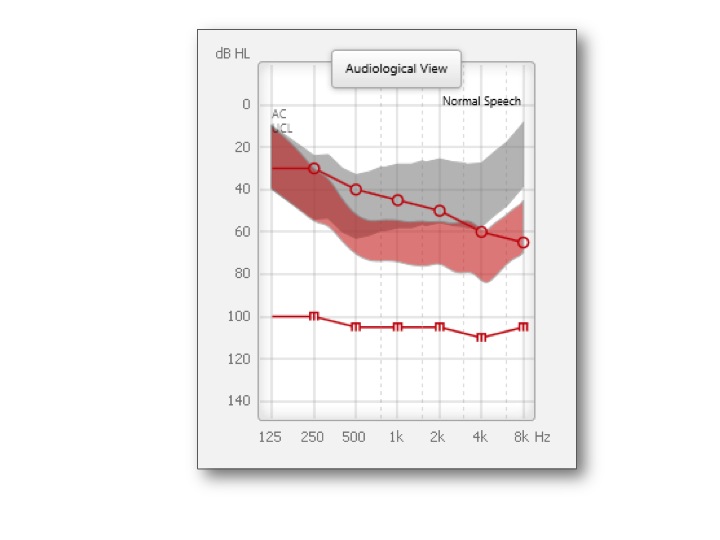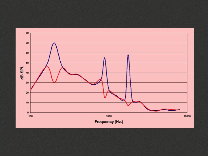 One of the most effective ways to help a person improve speech understanding in noise is to put a hearing aid on them. In Figure 14, the gray speech spectrum is the unaided speech spectrum in the presence of a mild to moderate, gently sloping loss. The red is the aided speech spectrum that the patient receives from the hearing aid.
