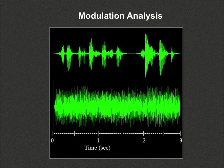 We usually talk about the speech signal as having a 30 dB peak-to-valley ratio. Those big peaks that are associated with the stressed vowels happen 30 dB above some of the softer, unvoiced consonants. Modulation analysis looks at how often the peaks and valleys occur, and also how deep the valleys are as compared to the peaks. This can be done mathematically, and is easily analyzed by a computer.