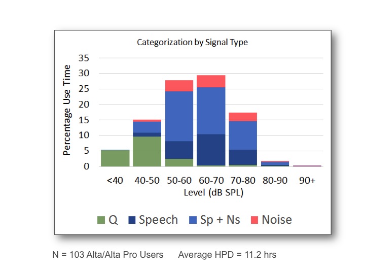 In everyday situations, noise reduction and directionality are not as active as you might think they are. Figure 13 shows data from 103 users of our hearing aid, Alta Pro (Figure 11). These patients use hearing aids on a relatively frequent basi, averaging over 11 hours per day of use. The data show the amount of time that different signals occur in the patients’ environments. The signal types are: speech, speech plus noise, or noise.