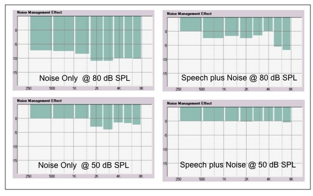 The bar length represents the amount of noise reduction deployed. Notice that when listening to noise only at 80 dB, you get a lot of noise reduction. If you either drop the overall level of the noise only down to a moderate level (50 dB), or if you mix in a speech plus noise situation, there is not as much noise reduction. As is the case with most hearing aids, this is because noise reduction is level-dependent. Additionally, a system like our TriState Noise management has additional analysis that will detect and protect the speech signal, even if it is imbedded in noise. Overall, across manufacturers, noise reduction is not designed to kick in until the environment is relatively loud.