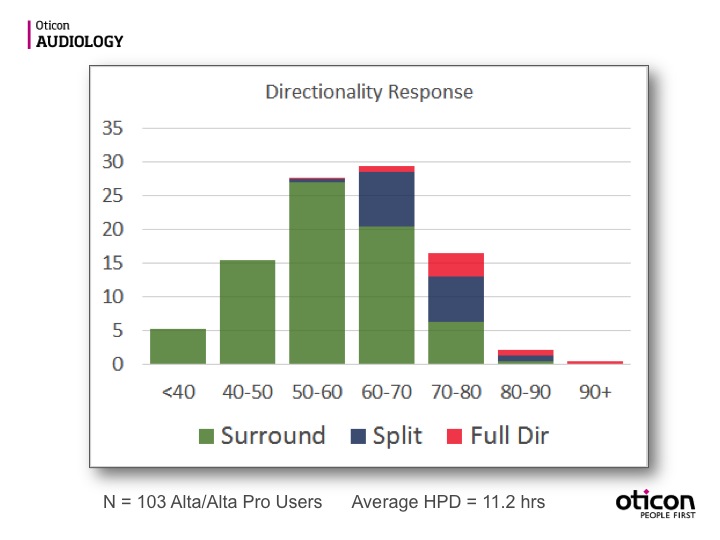 The same can be true of directionality. Figure 13 shows how often directionality is active in our hearing aids, and the data is typical across companies. We have three modes of directionality: surround (omnidirectional or surround sound); split directionality (directionality above 1000 Hz.) and full directional.