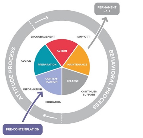 The Circle can be seen as an intervention guide. It is a tool that the clinician uses to identify the client’s readiness to change and to help the clinician decide how to support the patient. The circle looks at personal change as a process. First, a person needs to change their attitude and then they move on to changing their behavior. That is shown in the gray circle.