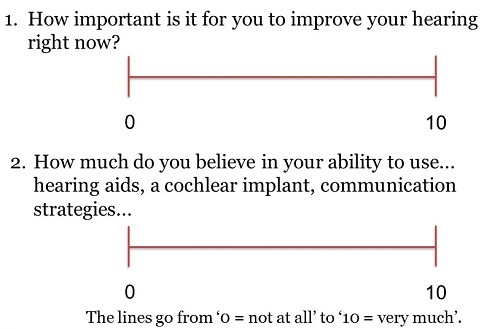 For example, if they scored themselves low, you can ask why they did not score themselves higher or vice versa. By articulating their reasons to you, the patient is required again to think about their motivation for improving their hearing and also their belief in their own ability to do so. This is an important step in the decision making process. People are more likely to be convinced by listening to their own arguments than those presented by others. By giving them these Lines and starting to explore why they put the mark where they did, we give the patients a chance to express themselves and bring forth their own arguments for creating the change.