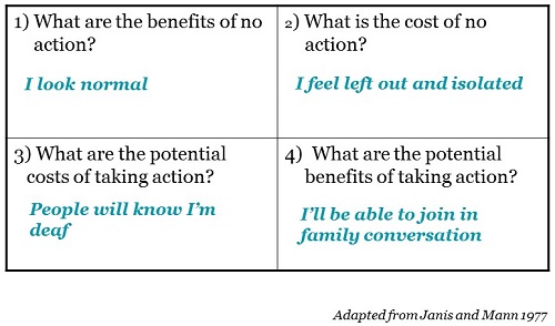 Let’s look at some possible answers on the four questions. One benefit of no action could be, “I look normal.” One answer to “What is the cost of no action?” could be, “I feel left out and isolated.” The answer to “What are the potential costs of taking action?” could be, “People will know I am deaf or hard of hearing”, and the answer to “What are the potential benefits of taking action?” is, “I will be able to join in family conversations.”