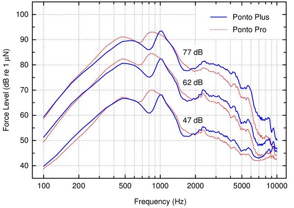 The outputs of Ponto Pro and Ponto Plus were measured on a TU-1000 skull simulator (Håkansson & Carlsson, 1989) with ICRA noise presented at 47, 62, and 77 dB SPL (Dreschler, Verschuure, Ludvigsen, & Westermann, 2001).