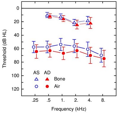All 19 patients, with ages ranging from 26 to 73 years (average: 46.1 years) had a bilateral conductive or mixed hearing loss. Patient thresholds were measured with standard procedures and equipment (Interacoustic Equinox audiometer fitted with TDH39 headphones and B-71 bone conductor). The average air and bone conduction thresholds together with their standard deviations are shown in Figure 2. The average air and bone conduction thresholds at 0.5, 1, 2, and 4 kHz were 57.0 dB and 15.4 dB for the left side and 65.7 dB and 18.2 dB for the right side, respectively.