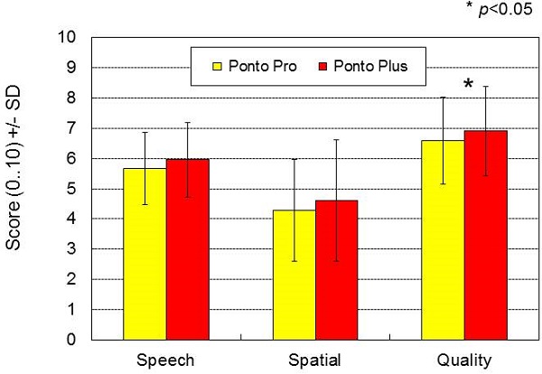 In the subjective evaluation of Ponto Plus and Ponto Pro with the SSQ questionnaire (Gatehouse & Noble, 2004), scores for the Quality domain were significantly higher (p<5%) for the Ponto Plus than for Ponto Pro (Figure 4). Differences for the Speech and Spatial domains failed to reach statistical significance (p>5%).