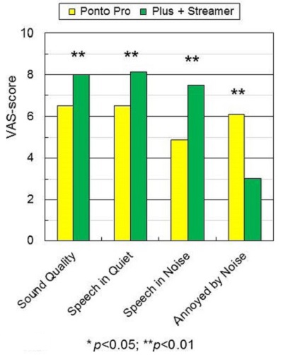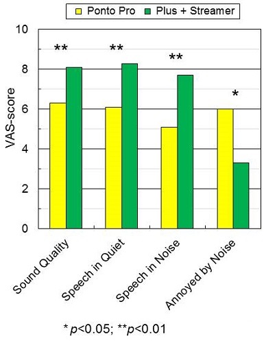 Proprietary questionnaires showed a (strong) preference for Ponto Plus with streamer over Ponto Pro in 13 out of 19 subjects, thus underlining the importance of wireless connectivity. In fact, they regarded wireless connectivity the most important distinction between Ponto Plus and Ponto Pro.