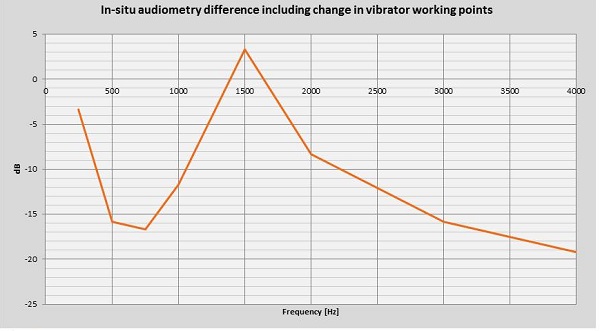Figure 14. In-situ audiometry difference between percutaneous and the transcutaneous passive solution, including the change in vibrator working points.