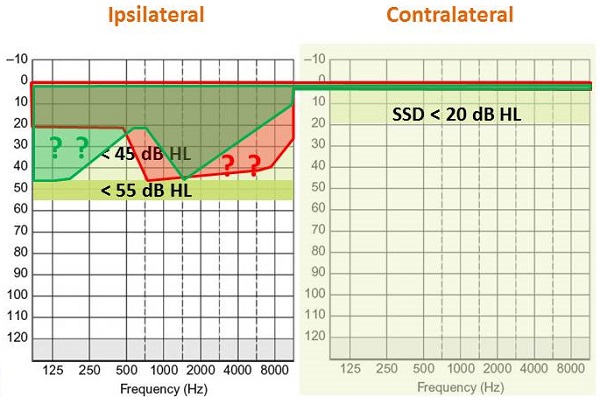Figure 15 shows the differing fitting ranges of the percutaneous and transcutaneous systems. The ipsilateral percutaneous solution will give you a fitting range up to 55 dB. If you are comparing that with the active transcutaneous system, low-frequency gain will be a challenge, but the high frequencies look good. The passive transcutaneous system loses more of the high frequencies and some in the low-to-mid region.