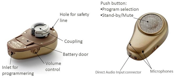 Figure 9 is a close-up of the Ponto Pro sound processor. It has all the features of an advanced hearing aid, including program selection, tamper-proof battery door, volume control and an inlet for programming. There is a large push button for the patient to change the programs. We have water and dirt resistance through nano coating with an IP57 classification. There is a safety line, which is important for children. The metal spring coupling system makes it durable and easy to snap on and off, as well as the tamper-resistant battery door and low-battery warning system. These digital devices are programmed using a similar interface and process as hearing aids.