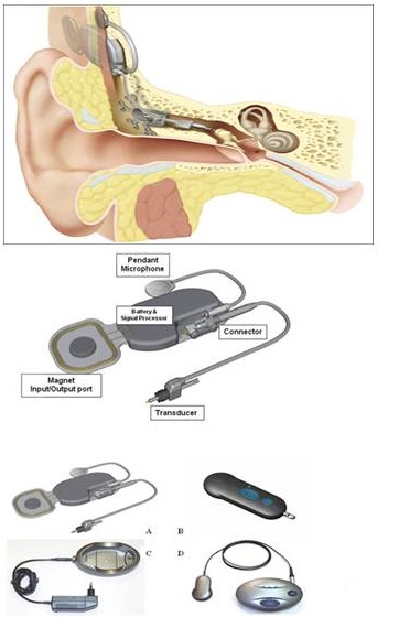 There are no microphones in this device. It consists of three parts: the sensor, speech processor, and driver (Figure 4). It uses the natural dynamics/vibrations of the ossicular chain. A sensor picks up the vibrations from the incus, and those vibrations are fed into the processor, like an internal hearing aid, which are then transformed into electrical signals, processed and amplified by the processor, which then turns the signal back into vibrational energy to the stapes. The vibrator is attached to the head of the stapes bone. The entire device is imbedded inside.