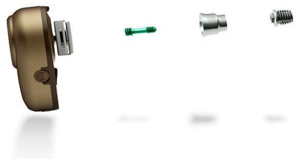 For many years, the Baha was the only device available. In 2009, Oticon Medical introduced the Ponto system (Figure 5). This coupling system, including the abutment and implant, functions like a bridge between the sound processor and the abutment. The sound processor attaches to the abutment, which is kept in place with a screw, and the implant is imbedded in the skull. The sound vibrations are picked up from the microphone outside and are transformed into mechanical vibrations that are transmitted along the abutment and implant into the temporal bone of the skull.
