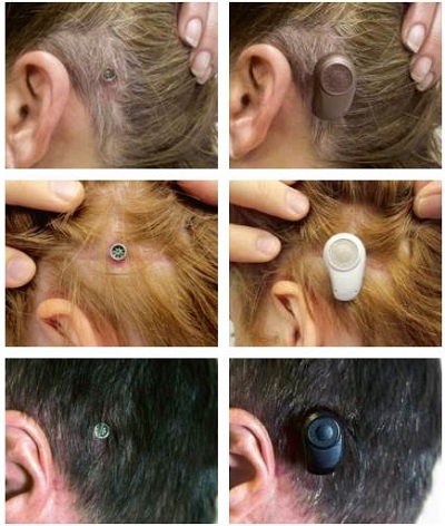 Figure 13. Passive transcutaneous skin-drive options: Sophono (left) and BAHA Attract (right). Sources: Sophono.com and Cochlear.com