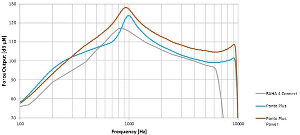 Percutaneous bone anchored processors gave the most power, resulting in the most gain. Direct bone conduction is the most efficient energy transfer to the skull. The Ponto Plus Power is the most powerful processor available, as shown by comparison in Figure 10. This is the frequency response from the Ponto Pro, Cochlear BAHA 4 Connect and Ponto Plus Power. The MFO is the maximum force output. Because it is a vibratory device, we are dealing with forced output.