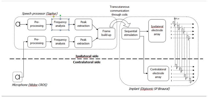 Each microphone corresponds to one electrode array. The sound is routed to the corresponding electrode array to restore stereophonic perception. There is one speech processor and one implant with two electrode arrays.