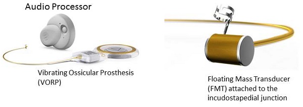 It consists of an audio processor with an implanted coil on the inside. The audio processor (Figure 1) transmits the information transcutaneously to the implanted coil on the other side. That sound is then transformed into an electromagnetic signal by the coil that wraps around the implant. The implant itself is called a floating mass transducer (Figure 1), and it is attached to the junction between the incus and the stapes. The audio processor functions like a hearing aid by picking up the acoustic sounds and the vibrating ossicle or prosthesis and then transforms the acoustic energy into electrical energy, which drives the transducer.