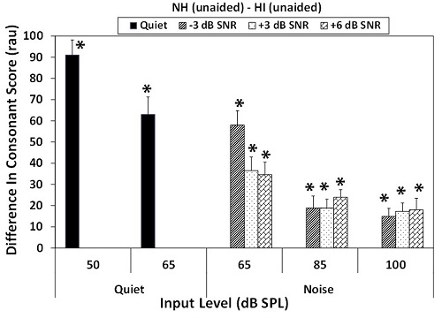 The major difference between the normal hearing and hearing-impaired group is the soft sound in quiet situation. As the situation gets louder from 65 to 100 dB, there is less of a difference. Although it was statistically significant, the magnitude of that difference decreased between the normal and the unaided condition - about 20% at a loud, noisy level.