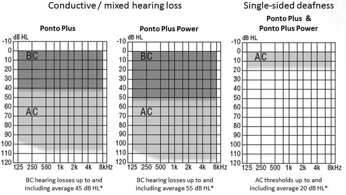 The fitting ranges remain the same as with the previous sound processor families (Figure 3). Pure conductive losses and mixed hearing losses that have average bone conduction thresholds up to 45 dB can be fit with Ponto Plus, and mixed hearing losses with average bone conduction threshold up to 55 dB can be fit with Ponto Plus Power. Single-sided deafness cases with completely normal hearing in the good ear can be filled with Ponto Plus. If you have an SSD case with a slight high-frequency hearing loss in the good ear, you could consider Ponto Plus Power.