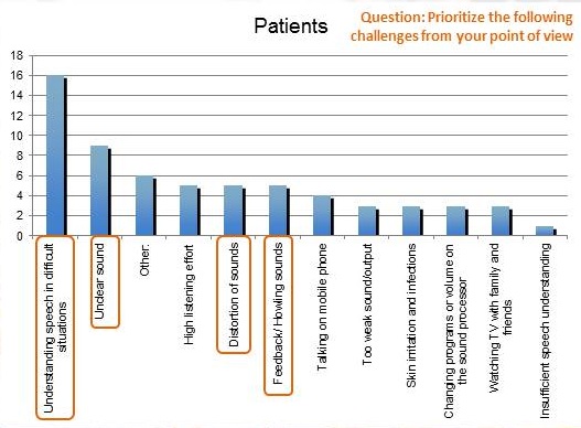 Another priority was feedback. We already felt like we had a great feedback system, but we recognize that we want to improve what we already have. The third topic is a combination of two issues: unclear sounds and distortion of sounds. We wanted to focus on producing a stronger device so that patients would not be bothered by unclear sound or distortion of sounds. They can enjoy the full dynamics of sound.