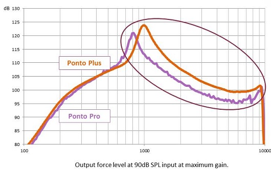 During development, we also fall/drop tested more than 100 of these transducers to ensure our reliability standards. The result of this engineering for your patients is a more powerful processor. Figure 5 shows an improvement in the mid to high frequencies for the Ponto Plus over the Ponto Pro. Furthermore, the Ponto Plus Power had an average increase of 3 to 4 dB across the same frequencies.