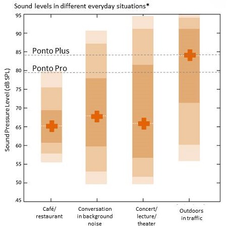 Figure 6. Variations of sound levels in everyday listening situations. The orange + indicates average intensity (dB SPL) for the given environment; the dashed lines indicate the intensity ceiling for each sound processor before sounds become distorted.