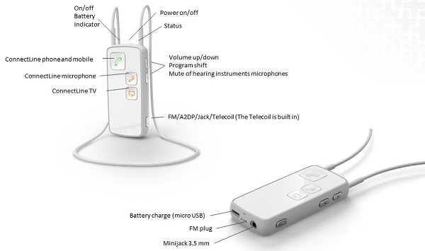 Figure 8 shows a schematic of the Ponto Streamer and the functionalities of the buttons and ports. You will note that the button to connect to FM also is used for audio jack, the built-in Telecoil, and A2DP, which is a type of Bluetooth. It is the same kind of Bluetooth that is employed in a car system that allows you to connect your cell phone with your car. The other buttons are similar to the functionalities of the Oticon Streamer.