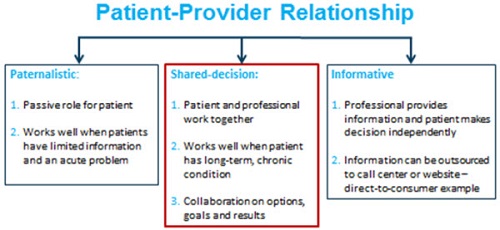 Another hallmark of the baby boomer patient is a need to more actively participate in the decision-making process with respect to their healthcare. To understand the impact baby boomers have had on the healthcare decision-making process, it helps to examine its history. During most of the 20th century, medical decisions shifted from a paternalistic to an informative-based system, which can be plotted on a continuum as shown in Figure 1. In a paternalistic system, the patient maintains a passive role with the healthcare provider and doesn’t take responsibility for the result of the decision. On the other end of this continuum, an informative-based decision, which has become more popular with the advent of automated, computer-based decision-making algorithms, enables patients to autonomously sort through their healthcare options and make decisions independent of their medical professional.