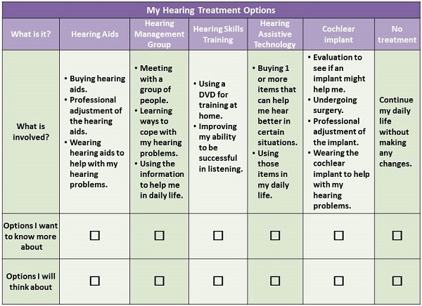 In short, SFI allows audiologists to have more productive conversations with patients about the consequences of their hearing loss and the actions that can be taken to address it. As the name implies, SFI centers on identifying solutions to everyday communication problems, rather than the cause of their hearing loss, or the results of the hearing assessment. These conversation are intended to evoke behavior change on the part of the patient. SFI works by activating the patient’s own reasons or motivations for change. SFI works effectively when the patient is provided a range of possible treatment or remediation choices. For example, the decision matrix shown in Figure 4, which is a cornerstone of the shared decision-making process, guides the patent through several possible options. The role of the audiologist is to review each of the possibilities along with pros and cons of each option, and to collaborate on the decision.