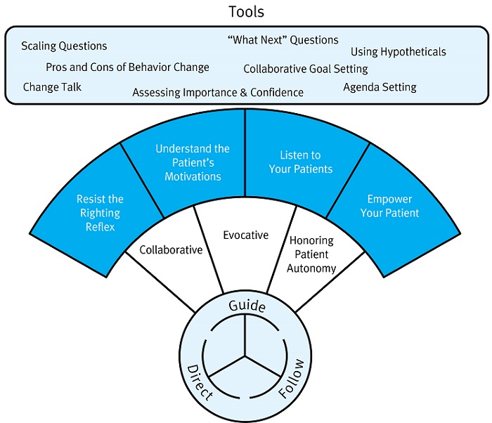 Figure 6. A schematic overview of SFI or Motivational Interviewing. The circle at the bottom of the schematic denotes the three types of conversations. Important SFI principles and techniques associated with a guiding conversation are listed above it.