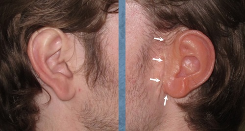 Figure 6. Prosthetic (right) versus normal ear (left). White arrows indicate connection to the skin.