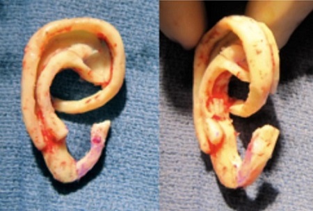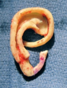 Rib cartilage surgery is the traditional surgical method that has been used for over 50 years. In this technique, you take a portion of the rib cartilage to make the ear and place the framework (Figure 7) under a pocket of skin that is in the scalp. The important thing to understand is that it uses the patient’s own tissues.