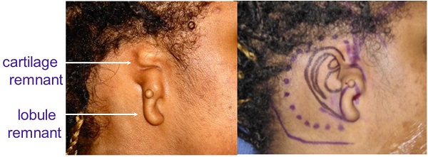 Figure 8 shows a grade 3 microtia with cartilage and lobular remnants. The picture on the right is our drawing for this young woman, who was 14 at the time of surgery.