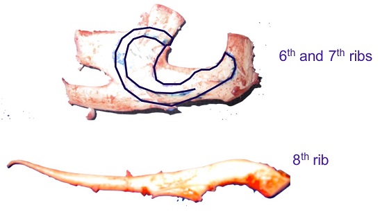 Figure 9 is a drawing of the rib cage and the incision line that we use to harvest the rib cartilage between ribs six, seven and eight.