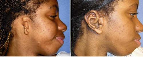 Figure 21. Prominent ear and microtia, where the prominent ear was pinned back and the Medpor technique was performed on the right ear.