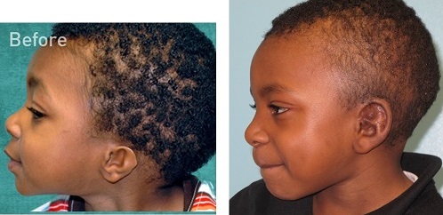 Modifications to the technique over the last ten years have reduced scarring so that it is very minimal now. In 2006, I developed a technique to make that small incision behind the ear to do the whole reconstruction. This little boy who wears a very short haircut, both pre-op and post-operatively, has no scalp scars (Figure 24).