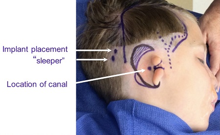 In this case, I have to determine the location of the canal because he does not have one. That is something we can feel anatomically with our fingers where it should go. I design my flap where the dots are (Figure 26) and the artery that supplies that flap. The purple outline on the scalp is the flap margins, although they are all taken from the small incision behind. The two dots in the hairline are where I place a sleeper, especially in boys, so that if anything happens to one implant, you have another one and it does not require general anesthesia again.