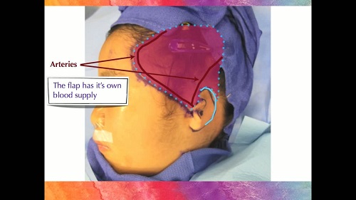 We use a very small incision, and through this incision, we can retrieve a membrane from under the scalp called the TPF flap. This thin membrane has its own arteries, veins, and nerves. The outline of the flap is drawn on the scalp, but it sits under the hair, skin, and fat. That living membrane is then used to cover the implant once it is in place. When we put suction on the flap, the flap pulls down over the implant and creates the ear. That ear can then be covered with skin grafts.