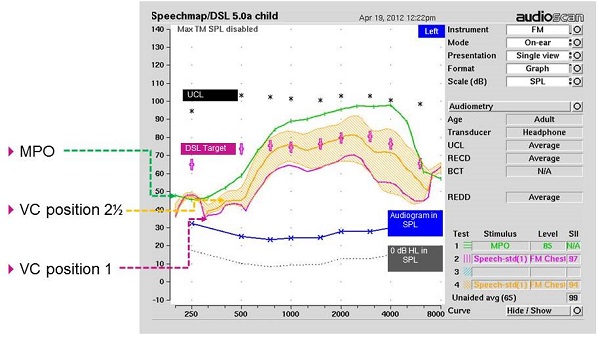 Figure 2 shows the different volume control settings from one to four as a real-ear response. The transmitter microphone is seated in the test box and the Amigo Star is on the child’s ear with a probe microphone down in the ear canal. The targets are based on thresholds within the normal hearing range, 15 dB across the frequency range in this case.