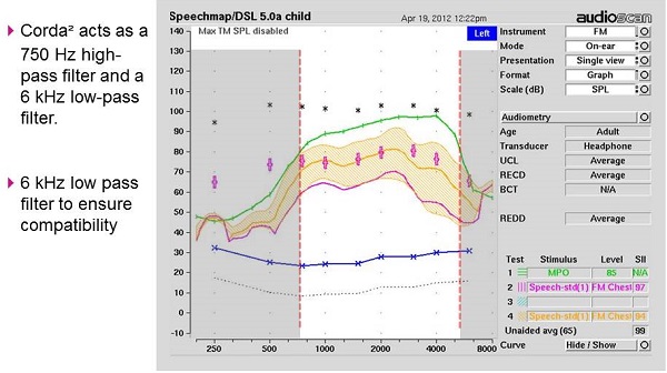 The Corda2 thin tube also acts as a high-pass/low-pass filter (Figure 3). You can see the high-pass filter is below 750 Hz, and that is due to the open dome configuration. We do not recommend the use of a closed mold with the Corda2 thin tube because it negates the open effect, especially with children who have normal hearing. There is no environmental microphone on this instrument, and we do not recommend that you close off the ear canal. Above 6000 Hz is a low-pass filter, and that is due to the natural attenuation of thin tubes. We built in a low-pass filter that allows for compatibility with the Phonak transmitters, as well.