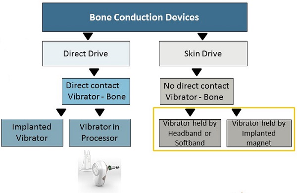 Figure 1 compares the bone conduction devices and also shows how they are related in terms of sound transmission. On the right side, we have skin drive systems, which was the industry's first idea, which we now know to be fairly simple.