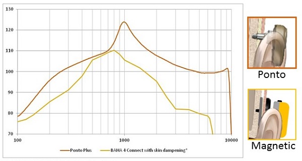 In Figure 2 we have a comparison of the output of a Ponto Plus device on an abutment to the output of a magnetic skin drive device. The curve has been corrected because of attenuation that is happening because of the skin drive system. The exact values of the correction are taken from the Verstraeten et al. (2008) study, and the magnetic device has lower output in the mid to high-frequency region. That is further compounded by the attenuation through the skin.