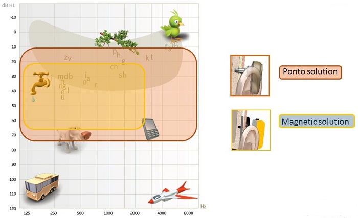 Figure 3. Patient schematic showing the range of audibility for the Ponto solution (red) and a skin drive magnetic solution (yellow).