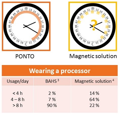 Patients who wear Ponto report minimal physical sensation of the device. They report that it stays securely in place once they have attached it to the abutment, and they have not reported other factors that prevent them from wearing it as recommended, which is during all waking hours. We want bone anchored patients to have the same kind of daylong benefits as conventional hearing aid patients. Figure 5 shows a comparison of wearing time between a magnetic skin drive solution (Ray, 2014) and a BAHS (Dutt, McDermott, Jelbert, Reid, & Proops 2002). These reports illustrate the difficulty with using a skin drive solution in the same way as a percutaneous solution.