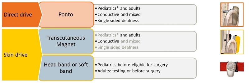 As treatment has evolved over time, we have moved to the left branch of the tree, or direct drive. In these solutions, there is direct contact between the vibrating source and the bone, for example, the percutaneous skin penetrating Ponto system. Direct drive is well proven as the best treatment for patients who require amplification via bone conduction.