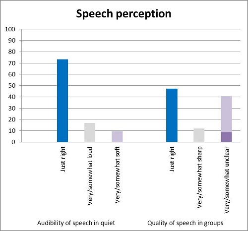 Satisfaction with speech perception. A strong motivation for hearing aid candidates is the desire to achieve better speech perception. The hearing aid candidates were therefore asked to evaluate the CLEAR hearing aid’s effectiveness in a relatively optimal speech perception situation in quiet surroundings, as well as in one of the, for hearing-aid users, most challenging situations, when several people in a crowd are talking at once. Seventy-five percent of the users responded that the audibility of speech was just right in quiet surroundings, while a small minority thought it was either somewhat soft (10%) or somewhat loud (17%). Not unexpectedly, speech perception was more challenging when several people spoke at once. Forty-seven percent of the users reported speech clarity to be just right in that situation.