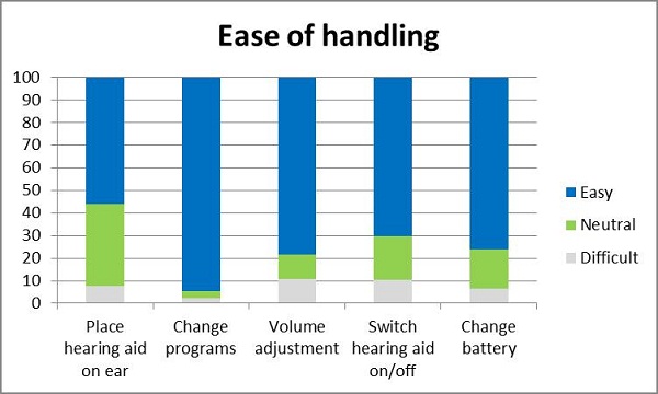Figure 6. Perceived ease of the basic activities of placing the hearing aid on the ear, changing listening program, adjusting the volume, switching the hearing aid on/off, and changing the battery.