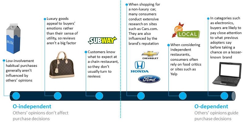 According to the authors, commodity purchases that you find in a grocery store and gasoline are very O-independent types of goods and services. We buy them out of necessity or habit. We do not talk to a lot of other people before we buy a gallon of milk or gasoline. We know that the quality is going to be even no matter where you get it, and these items are often at a relatively low price point.